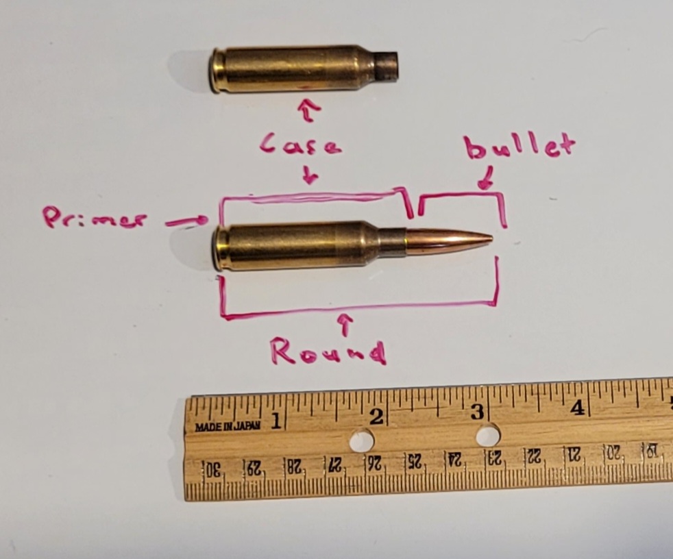 Case - part of a round that stays in the gun after firing. It contains a primer, powder and bullet or shot/slug for a shotgun